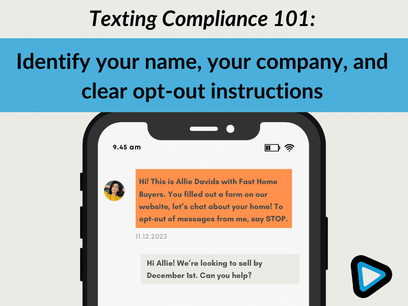 Include Identity in Initial Text Message: In an initial text message, make sure you identify the name of who is sending the text, your official company name, and clear opt-out instructions.